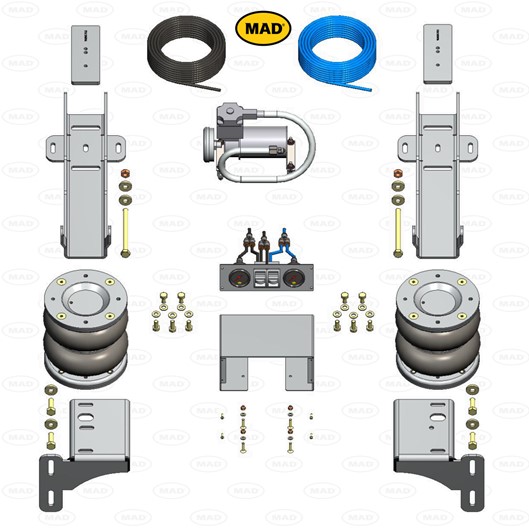 Black bag air system, black bags come in different designs depending on the application, load and space. They generally sit alongside the OE leaf spring or Torsion Bar. There are three types, Air Master Basic consisting of a pair of air bags, connecting air line and a Schrader Valve. Air Master Comfort type adds a compressor and gauges so you can inflate/deflate from the comfort of say, the drivers seat. The Automatic system is self-levelling meaning the vehicle height remains the same whether laden or unladen .